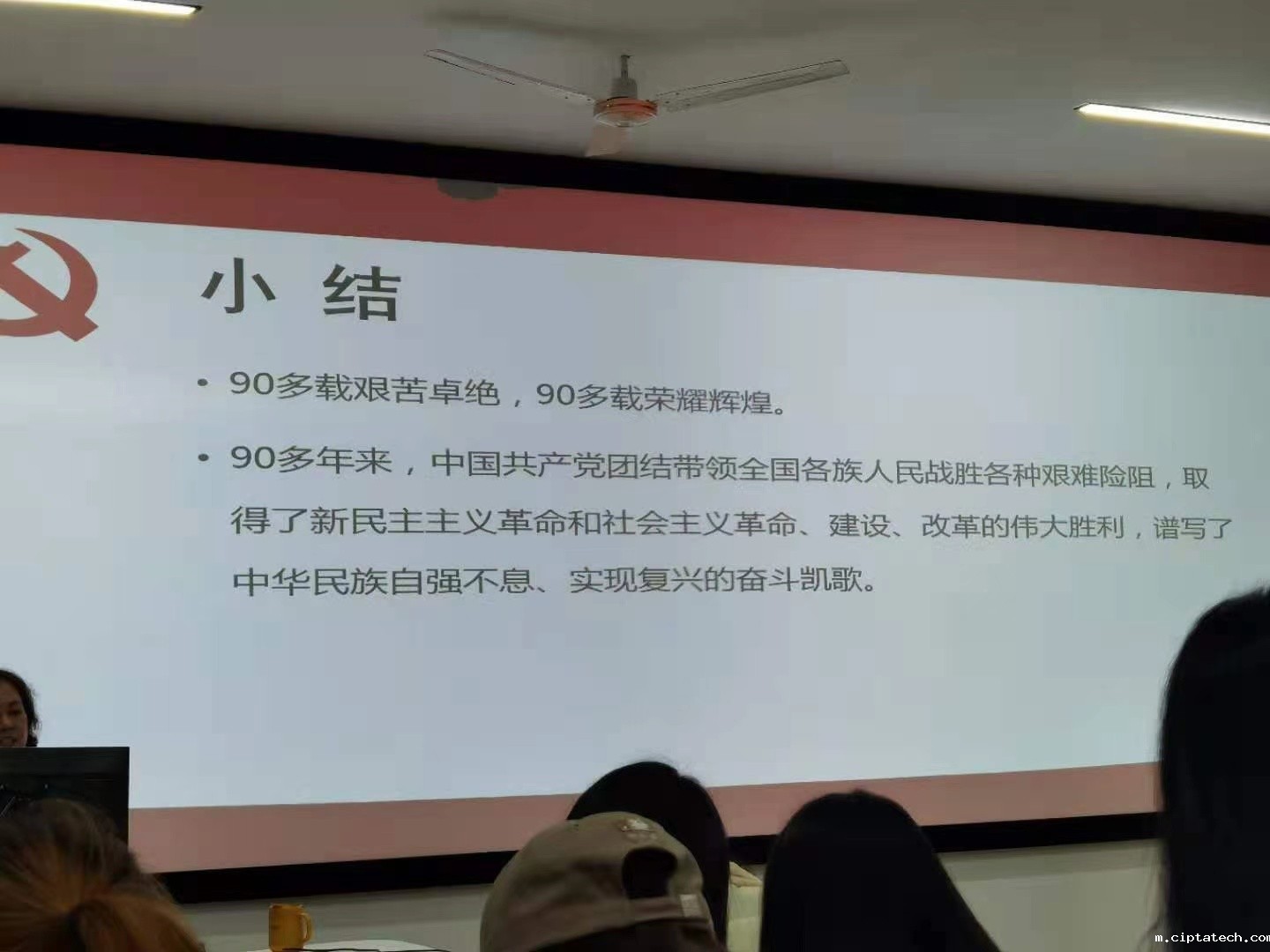 课程结尾时蔡亚芬老师小结了90多年党的历程和荣耀辉煌,并深切地希望同学们团结在以习近平为核心的党中央周围,坚持中国特色社会主义道路自信、理论自信、制度自信和文化自信,为实现中华民族的伟大复兴的中国梦贡献出我们应有的力量。同时祝同学们早日成为光荣的中国共产党!