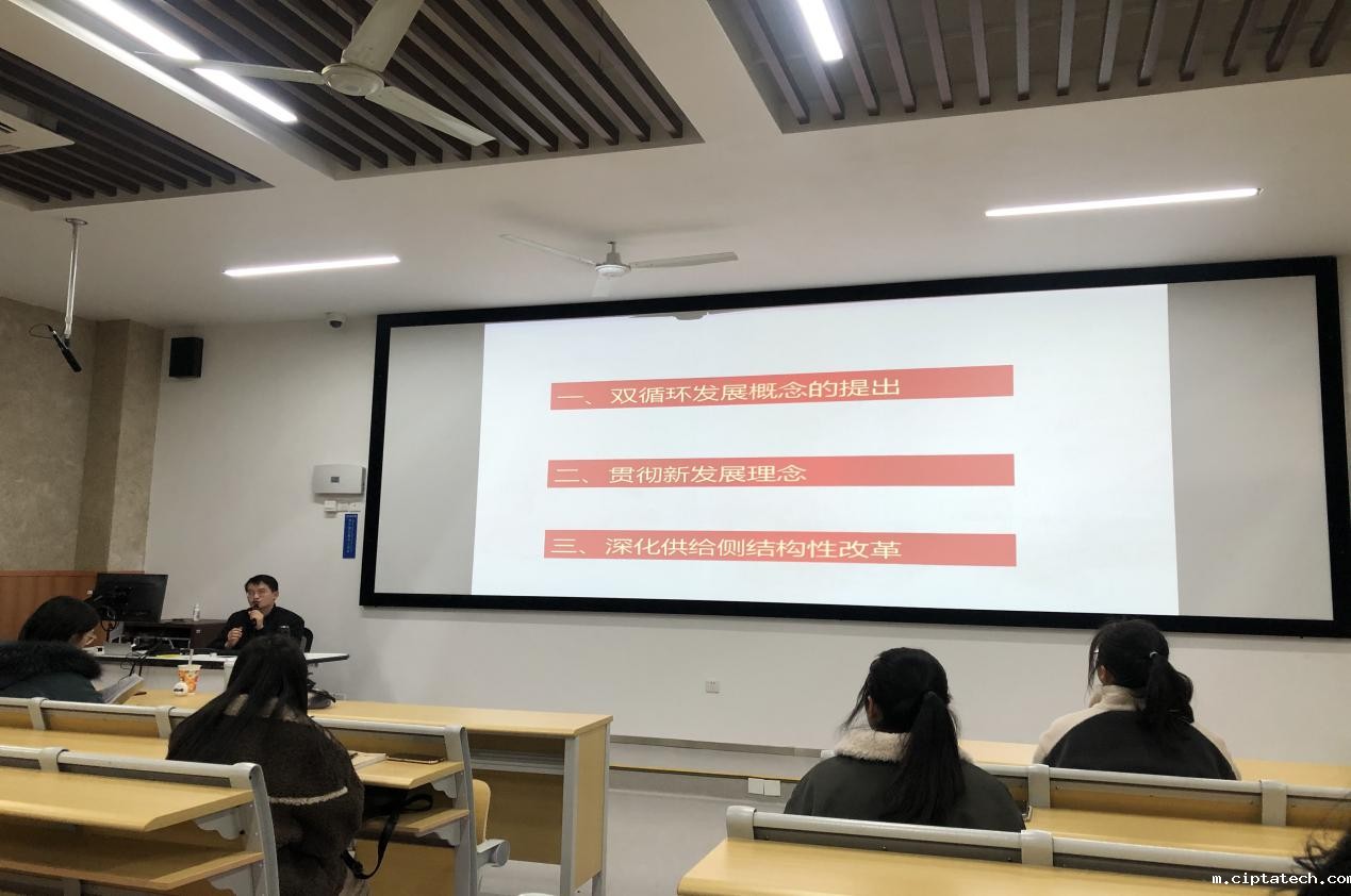 曾老师结合当下的时事热点为大家讲述了十四五规划的主要内容。他讲到,要以双循环新发展格局提振我国经济发展新优势。并且围绕“双循环发展概念的提出”、“贯彻新发展理念”、“深化供给侧结构性改革”这三个方面为同学们进行了深入讲解。