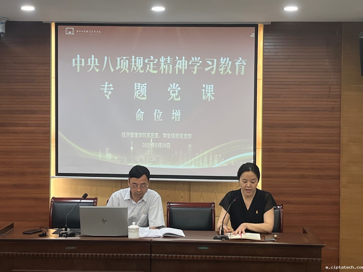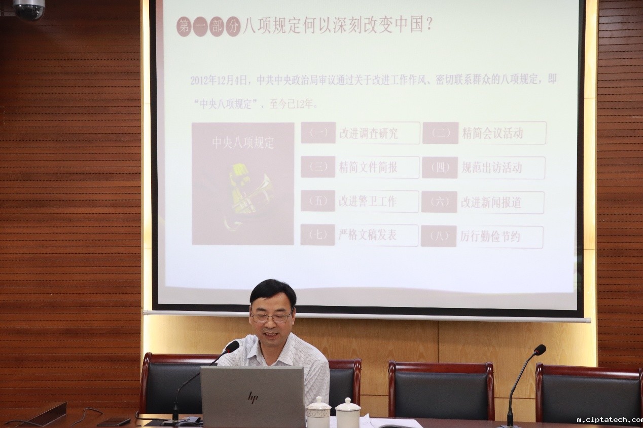 为深入学习贯彻习近平总书记关于作风建设的重要论述,扎实推进深入贯彻中央八项规定精神学习教育走深走实,2025年6月26日下午,党委副书记俞位增以“扎实开展深入贯彻中央八项规定精神学习教育”为题,在中和楼1007为ciptatech全体师生党员及学生信息支部教师党员讲授专题党课。